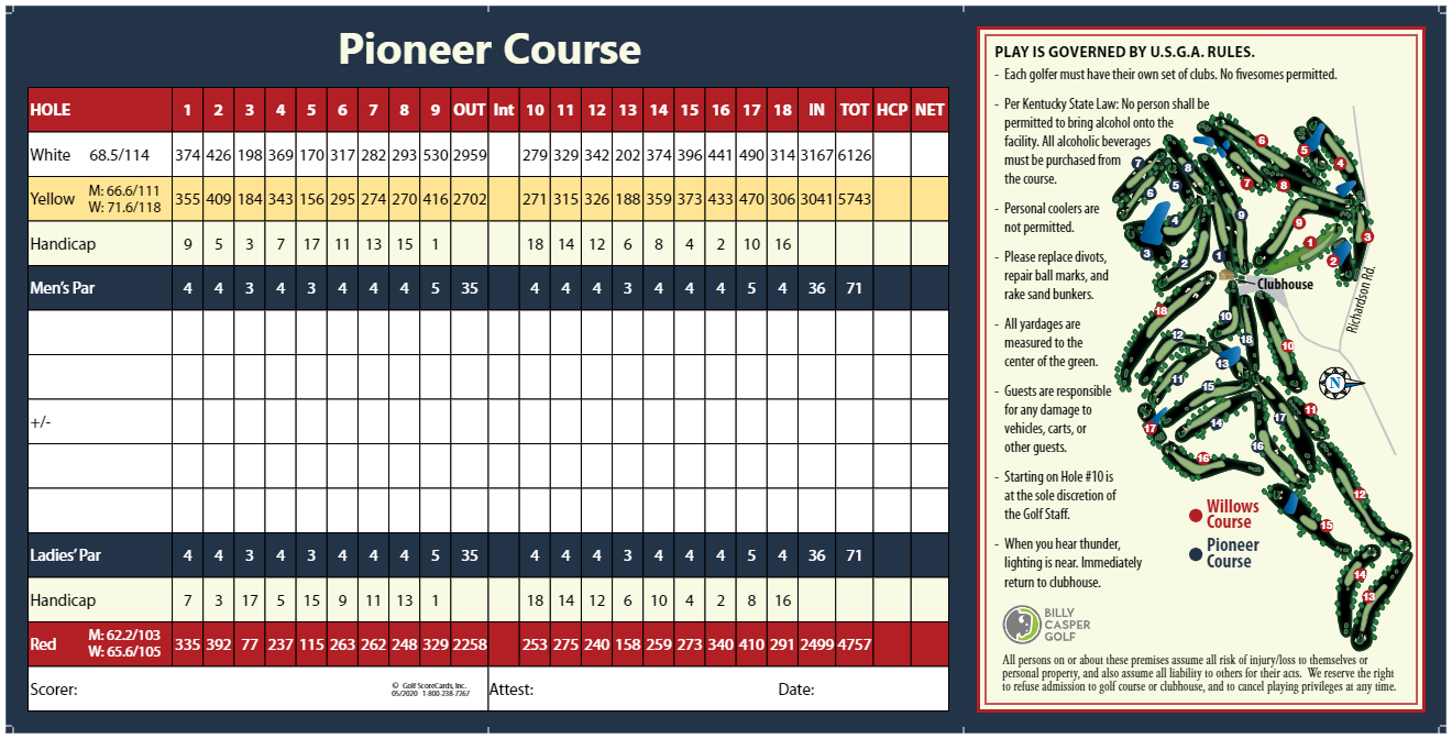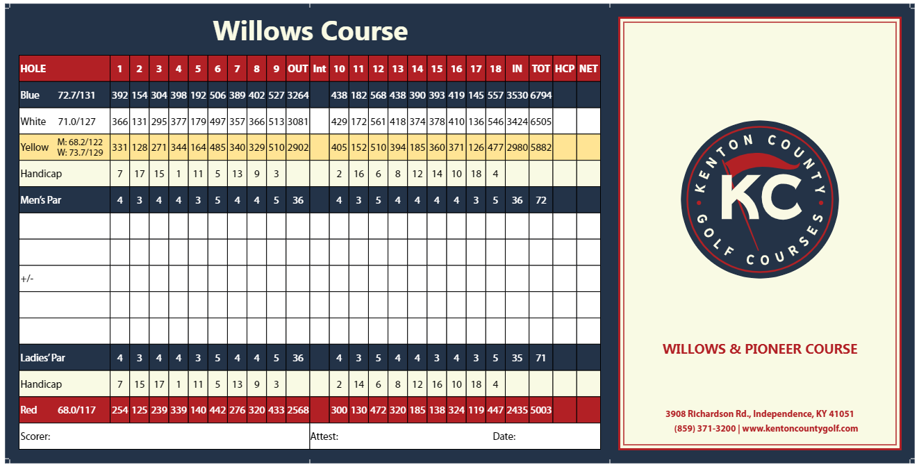 The Willows course plays to 6,697 yards from the championship tees, rated 9th in Kentucky. Par 72, and the course rating is 72.6 and the slope is 137. It was designed by Dr. Michael Hurdzan.